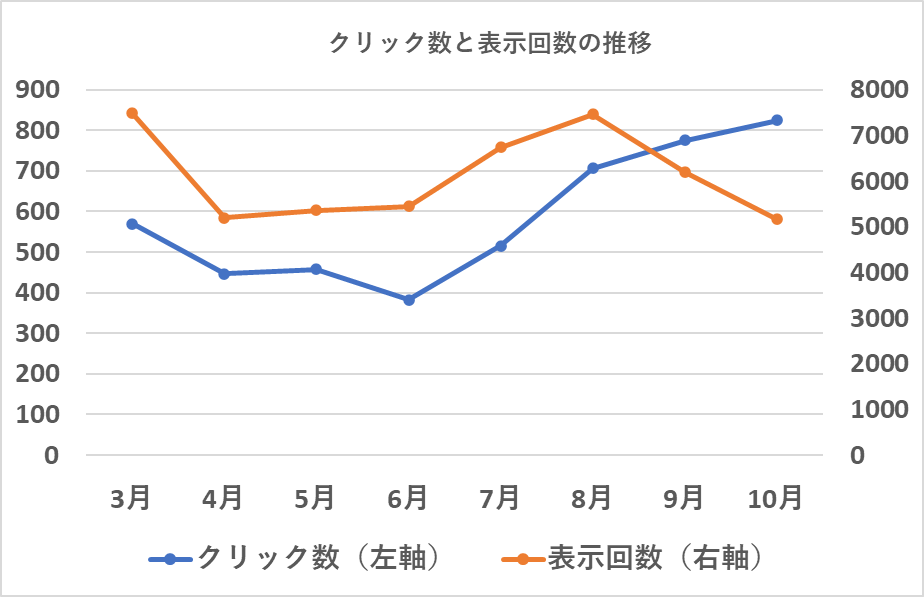 2024年10月頃から新規記事が少なくなっていった影響か、平均掲載順位は低下(グラフでは上昇)していきましたが、新規記事が増えてきた8月頃から上昇(グラフでは低下)している感じがします。