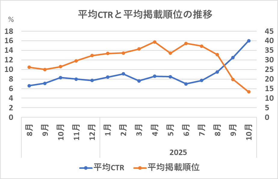 育休前の2024年8月から2025年10月までの平均CTRと平均掲載順位の推移を見てみます。
