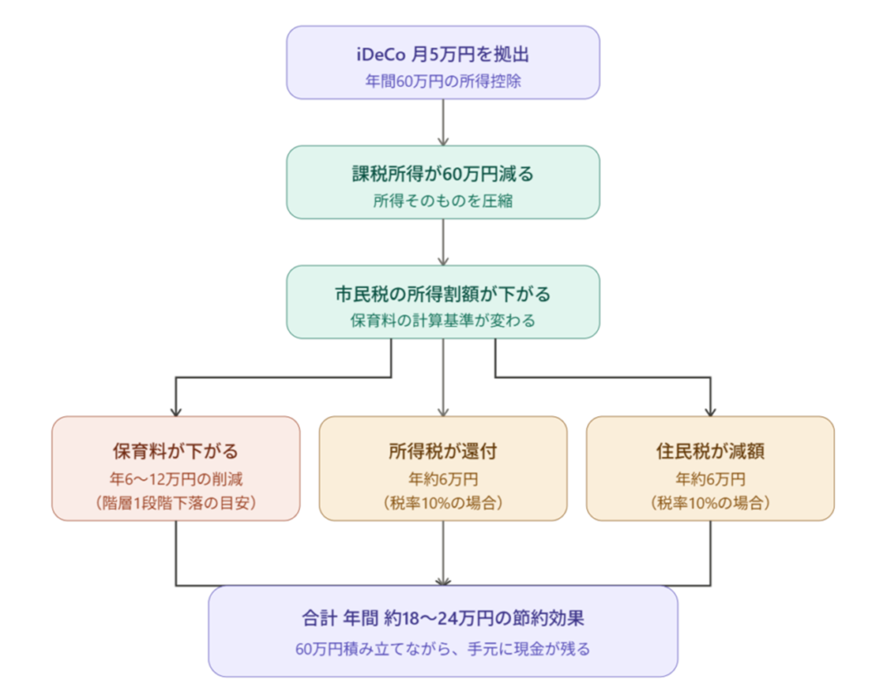 iDeCo拠出 → 課税所得が減る → 市民税の所得割額が下がる → 保育料の階層が下がる