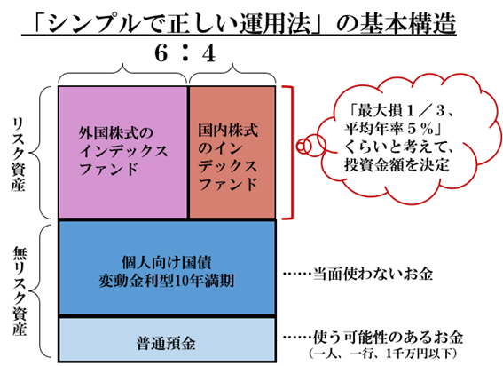 そして、1年後に「3分の1の損」と「4割の儲け」という広い範囲で変動しながらも、「平均的な投資のリターンは年率5%だ」と考えた上で、リスク資産に「金額でいくら」投じてもいいかを考えてみて下さい。